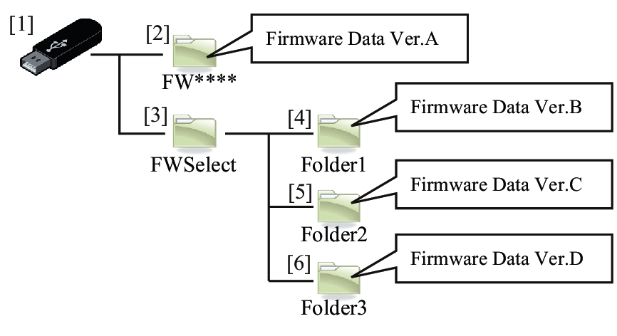 - 2. Создайте папку с любым именем (однобайтовые буквенно-цифровые символы, максимум 40 символов) в папке «FWSelect» и сохраните данные прошивки в этой папке.